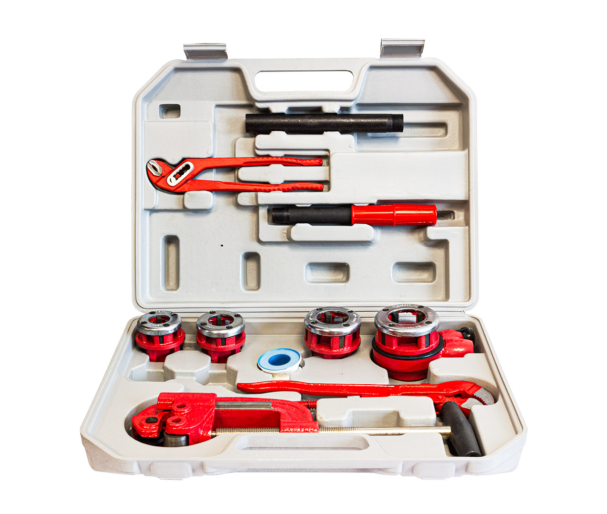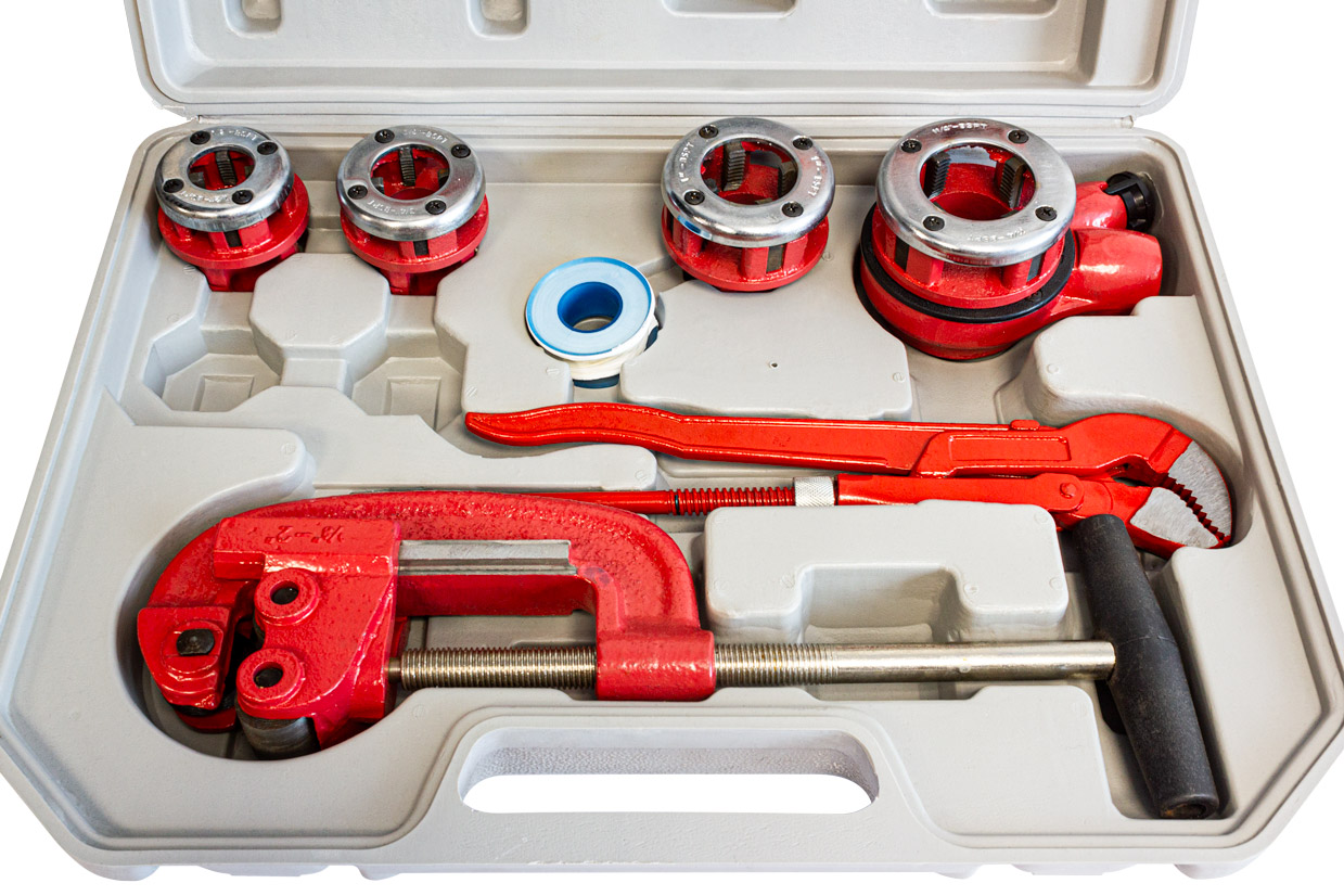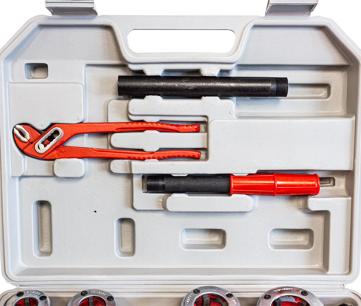 Набор включает в себя: резьбонарезной клупп с трещоткой, головки BSPT от 1/2 до 1.1/4, труборез для стальных труб СУПЕР 1.1/4, клещи тип SP 10, газовый ключ 1-дюймовый, пластмассовый чемодан.
