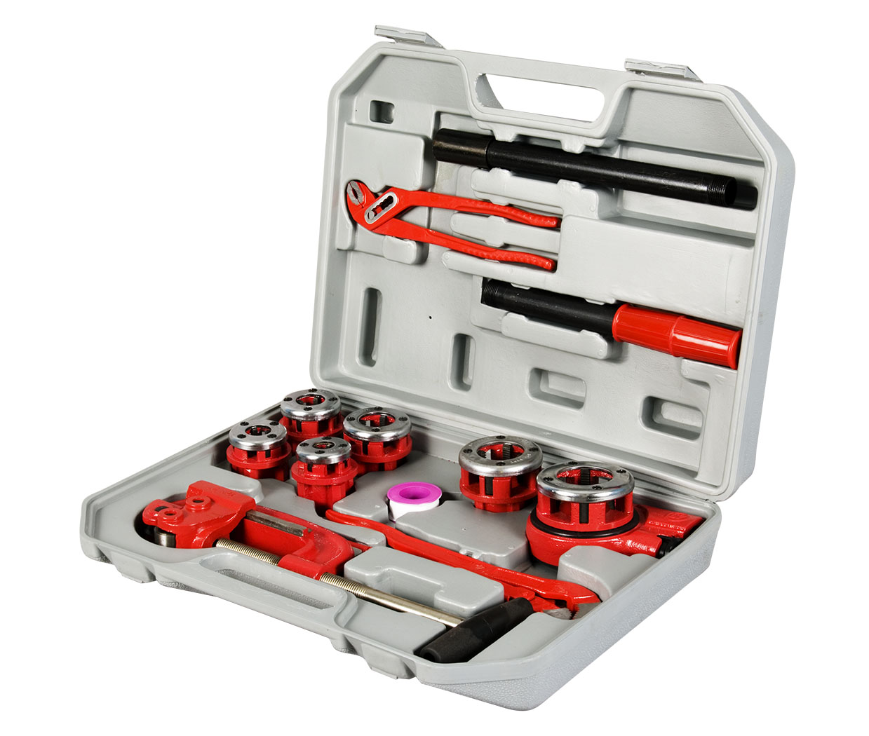 Набор включает в себя: резьбонарезной клупп с трещоткой, головки BSPT от 1/2 до 1 1/4, труборез для стальных труб СУПЕР 1.1/4, клещи тип SP 10, газовый ключ 1-дюймовый, пластмассовый чемодан.